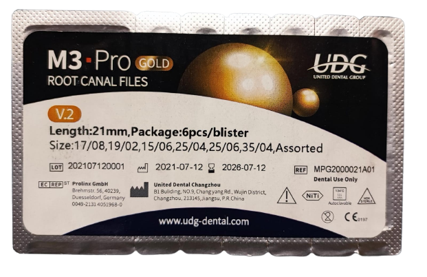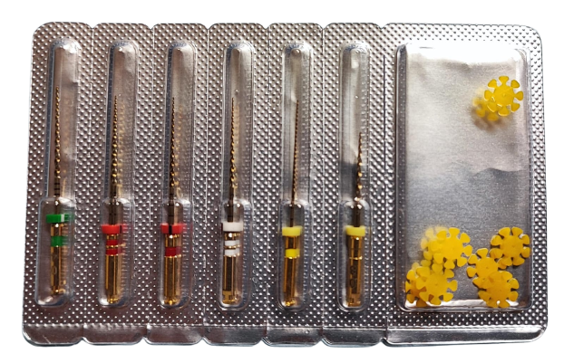 Lima Rotatoria ,Ni-Ti Termico dorado , Blister Con 6 Pzs, Tamaño/conicidad 17/08,19/02,15/06,25/04,25/06,35/04. Longitud: 21mm