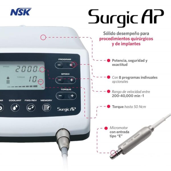 Diseñado específicamente para la cirugía oral e implantes, Surgic AP le proporciona toda la potencia y el rendimiento que usted siempre ha necesitado para dichos procedimientos. 210W de potencia y 50 Ncm de Torque, junto con una amplia gama de velocidades de 200-40.000 min., ofrece la rápida flexibilidad y respuesta requerida para una gran variedad de procedimientos quirúrgicos. La consola Compacta es fácil de usar, simple de operar y ha sido diseñada específicamente para el medio ambiente aséptico.